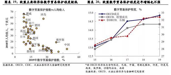 长期以来,欧盟各成员对数据资源的保护力度不足,德国、法国、荷兰等欧盟主要经济体数字贸易保护程度较低,近年来数字贸易保护程度的增幅也逊于其他经济体。数据传输限制是数字贸易保护的重要组成部分,但美国凭借《安全港协议》、《隐私盾协议》获得欧盟数据传输审查的豁免权,长期无限制地获取欧盟数据资源。但今年欧盟的数据保护意识明显增强。7月,欧盟法院裁定美欧间的数据传输协议《隐私盾协议》无效,美国企业由欧盟向美国传输数据不再享受豁免权,必须接受欧盟对隐私安全的审查。欧盟对数据传输的政策明显收紧,美国企业攫取欧盟数据资源的难度可能会持续加大。