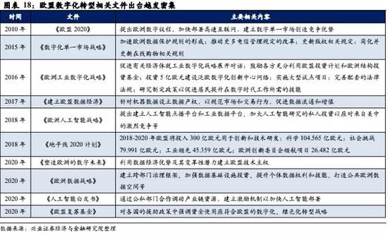 欧盟数字化转型文件出台越发密集,力图打破美国数字垄断。美国科技企业在搜索、社交、出行、支付等多个领域垄断欧盟市场。为打破这一局面,欧盟近年出台数字化转型文件越发密集,仅2020年就出台《塑造欧洲的数字未来》、《欧洲数据战略》、《人工智能白皮书》三份文件,内容上涵盖数字化必备的基础建设、人员技能培训、企业转型、法律法规更新等多个方面。欧盟已在加紧数字化建设的步伐。