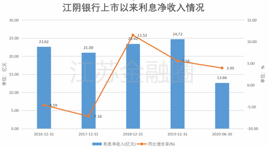 数据现实,江阴银行上半年利息净收入为12.66亿,同比增速只有3.95%。我们观察到,2016年上市以来,江阴银行的利息净收入增长就持续无法突破,在2016年和2017年连续两年出现下滑,直到2018年才出现一次大幅回升,到2019年利息净收入达到24.72亿,是截至目前历史最高点,但增速只有5.58%。
