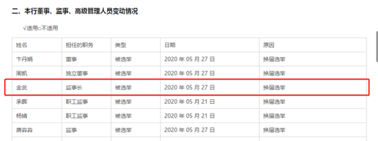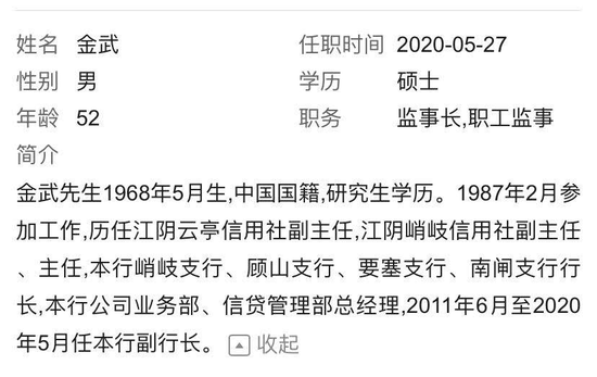 今年5月份,江阴银行对外披露,副行长金武因职务变动,辞去副行长职务,辞任后将仍在本行任职。半年报显示,金武目前担任监事长、职工监事一职。
