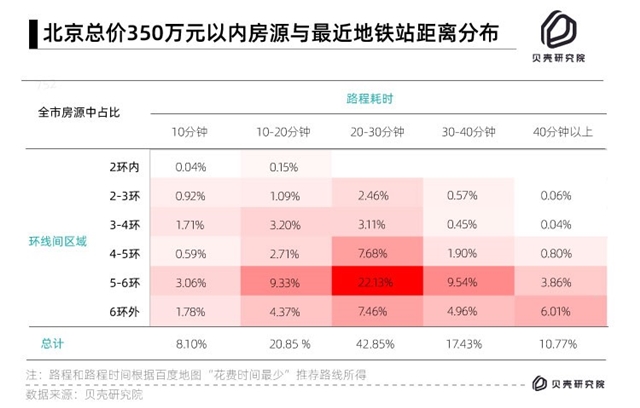 对于上班族而言,出行便利、职住通勤距离是必须要考虑的因素。贝壳研究院计算了总价350万以内所有房源到其最近地铁站的路程和所需时间,仅10.8%的房源距离最近地铁站的路程在1公里以内,28.95%的房源距离最近地铁站路程耗时在20分钟以内。
