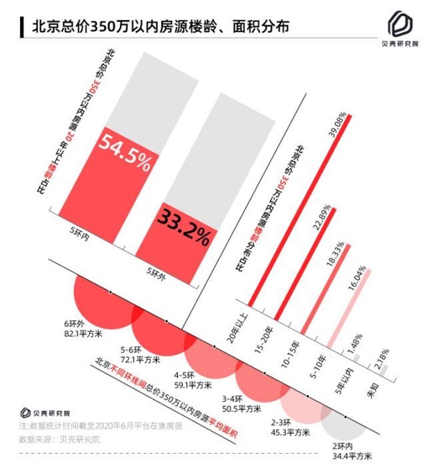 贝壳研究院数据显示,北京总价350万以内的房源平均面积69.58平方米,近四成房龄在20年以上。总价350万元以内房源中,5环内房龄20年以上的房源占54.5%,而这一比例在五环外仅为33.2%;6环外房源平均面积达82平方米,而2环内仅为34.4平方米。越往外围符合刚需们的房源越多,但这并不意味着在五环内刚需们就没有了选择,只是很大可能要在房龄、面积等条件上做让步。