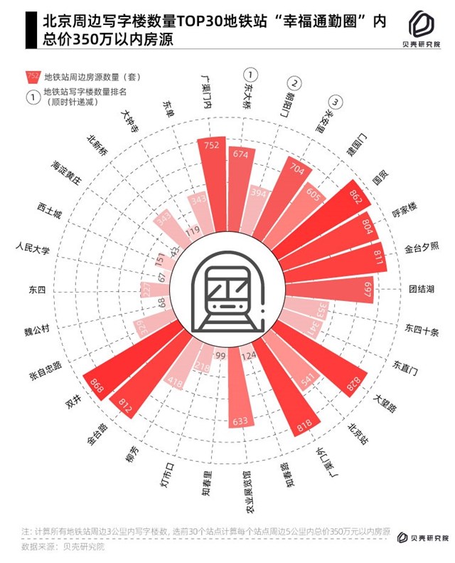 从家门口到地铁站的路程影响居住出行,而从家门口到公司的距离则决定能否实现“幸福通勤”。贝壳研究院以职住距离小于5公里作为幸福通勤的标准,假设写字楼多的地方工作机会也多,选出周边3公里内写字楼数量最多的30个地铁站为目的地,再以每个地铁站为中心划出5公里“幸福通勤圈”。