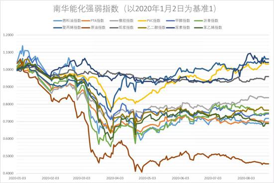 2020年市场经历了多项重大事件的影响,行情走势可谓是风起云涌,能化板块整体在前期原油带动下走势相对偏弱,南华期货所特有的南华能化指数很好的为我们展现了清晰的能化板块分品种走势,如果以年初1月2日作为基点,大部分的品种仍然未回到年初的高点。国内经济在疫情后已有充分的恢复,市场重新将目光放到了品种基本面上,那么目前能化板块强弱分化的格局又是怎样的呢,南华期货咨询服务部下面将做一整理分析。