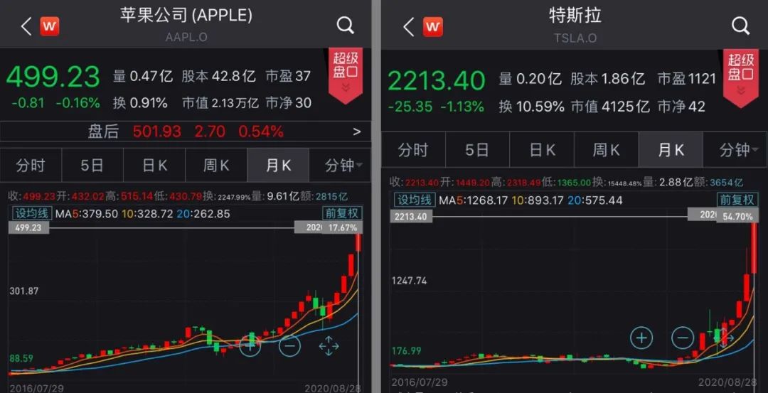 科技股表现尤其亮眼。其中,苹果8月累计大涨17.67%,特斯拉8月累计上扬54.7%,并有望创下2013年5月以来的最大月涨幅。目前,苹果、微软、谷歌、亚马逊和脸书五大科技巨头占标普500指数的权重已经超过20%。