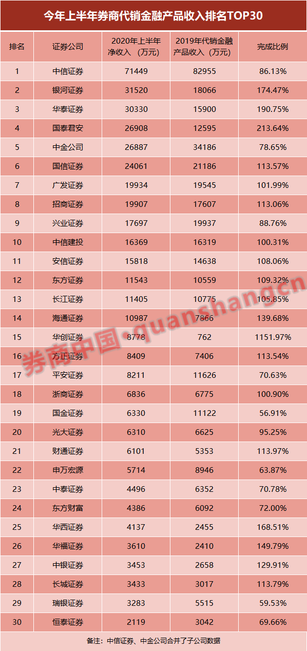 梳理发现,在该项收入排名前30的名单中,已有19家券商今年上半年代销金融产品净收入已经超过了去年全年的额度。其中华创证券去年全年完成了762万元的代销金融产品收入,今年上半年就实现了8778万,完成了去年全年额度的1151.97%;国泰君安、华泰证券、银河证券、华西证券等均完成了超出去年150%的额度。