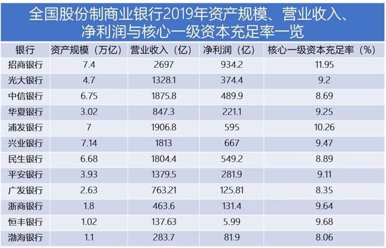 下图为全国性股份制商业2019年的资产规模、营业收入、净利润及核心一级资本充足率的对比。可以看到的是广发银行在核心一级资本充足率排名倒数第二,仅仅比渤海银行的指标稍微高出0.29%。同时,在资产规模及营业收入和净利润方面,排在了老牌的全国性股份银行最后。
