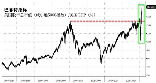 而目前股市总市值对GDP比值(巴菲特指标)已飙升至183%。