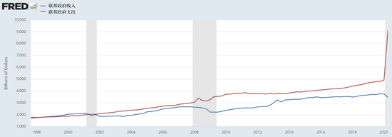 数据显示,联邦政府支出扩大到9万亿美元,而联邦政府收入下降到3.5万亿美元。这导致每年调整后的预算赤字为5.5万亿美元。