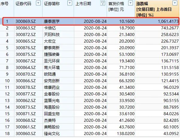 8月24日,创业板注册制首批18只新股上市,平均涨幅高达212%,最低涨幅超40%,涨幅最高的康泰医学,首日涨幅高达1061%,盘中更是一度涨幅高达2931%,发行价10.16元,盘中最高中一签(500股)约赚15万。位居其次的卡倍亿首日涨幅也高达743%。