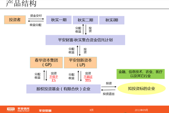 一名美元基金负责人告诉新浪财经,单看此基金的架构以及投资标的,感觉是非常像美元基金的条款,根据新浪财经获得的一份平安财富秋实集合资金信托计划的推介材料显示,该基金的目标内部收益率不少于20%(图一)。