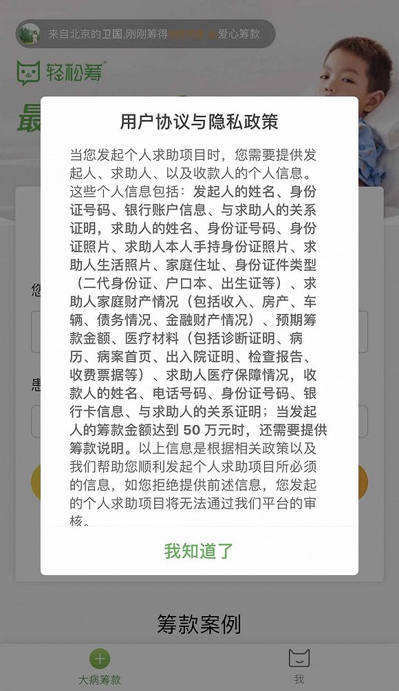 经界面新闻记者体验,在下载轻松筹APP后,将弹出一份《用户协议与隐私政策》。该文件称,轻松筹APP将通过注册成为用户、发起个人求助项目、个人捐赠服务、个人求助项目证明以及授权产品权限以上六大过程中收集用户信息。