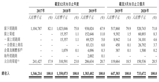 2017年至2019年,朝云集团通过线下渠道销售产生的收入占总收入的百分比分别为82.1%、75.8%和67.9%,而通过线上渠道销售产生收入占比则从2018年的1.1%大幅增至2019年的11.0%。2020年第一季度,朝云集团线下、线上的收入占比分别为71.0%和8.3%。