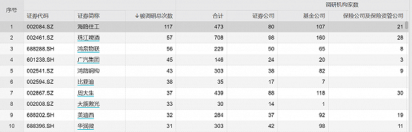 Wind数据显示,今年以来,被调研次数最多的企业是海鸥住工(002084.SZ)。该公司共接受了473家机构的117次调研,其中私募多达215家,公募基金达107家。