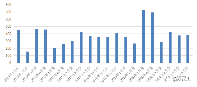 债券民工统计了2019年1月至2020年8月城投债的发行情况,详见下图。从图中数据可以明显看出,在经历了3月(5806.14亿元)和4月(5891.17亿元)的城投债发债高峰之后,5月份(2325.93亿元)开始了断崖式下跌,从6月份发行金额虽有上升,但增长并不显著。尤其是2020年的城投债发行金额(2847.30亿元),低于了2019年8月份的发行金额(3401.36亿元)。