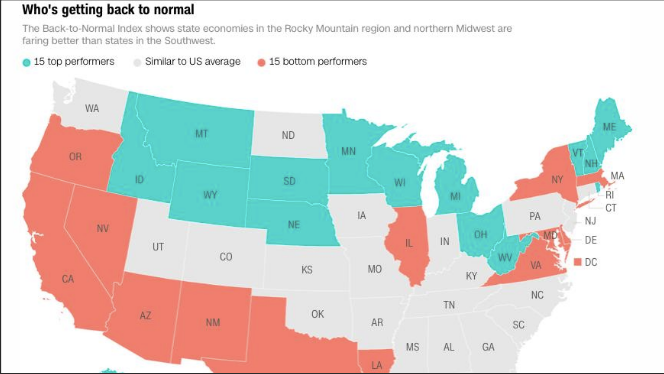 根据美国有线新闻网CNN基于37个常用经济指标编制的“回归正常指数”(Back-to-Normal Index),美国经济上周已经恢复到了疫情前的78.3%,今年4月17日该数据一度触及59%的年内低点。穆迪首席经济学家赞迪(Mark Zandi)指出,不同州之间的情况也不尽相同,限制措施开放越早的州面临的风险越大,同时农业州比工业州更快地从疫情中恢复,如南达科他州已经恢复到疫情前的93%,总体而言,美国经济并不会在短期内完全恢复。