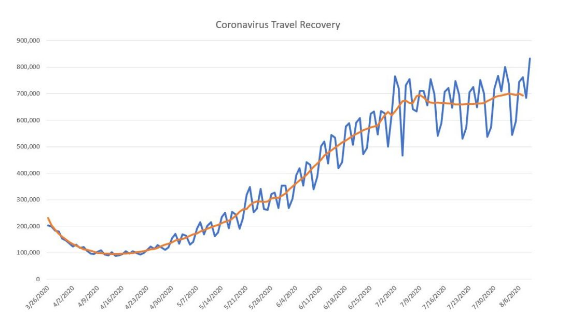 航空运输相对处境艰难,但形势也在逐步好转。第一财经记者注意到,美国运输安全管理局(TSA)连续第四周周末公布的航空乘客人数超过80万人。8月30日,共有807695名乘客通过机场安检,虽然与2019年同期相比仍有显著下降(188.8万),但显示了空中交通需求正变得逐渐正常化。在疫情最严重的4月下旬,美国单日航空乘客人数一度降至87534人。