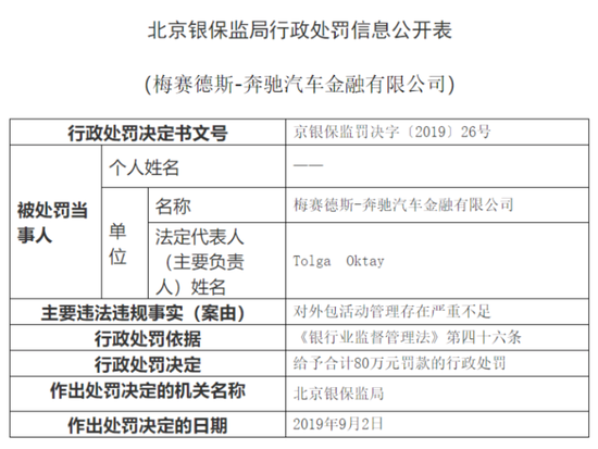 去年4月,西安一车主因奔驰车漏油,哭诉被收取“金融服务费”维权引发社会关注,9月2日,北京银保监局就此事对奔驰金融作出行政处罚,合计罚款80万元,案由为“对外包活动管理存在严重不足”。