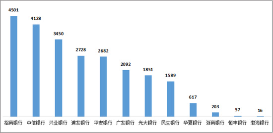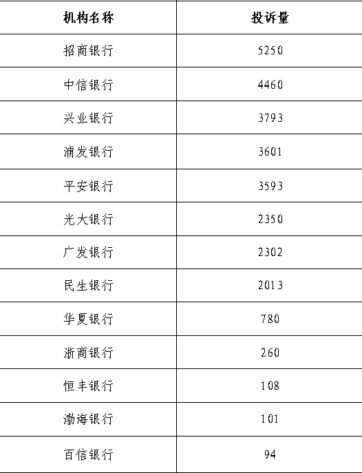 2.招商银行、中信银行、兴业银行的信用卡业务投诉量位居股份制商业银行前三名。股份制商业银行信用卡业务投诉量的中位数为1971.5件。其中,招商银行4501件,占招商银行投诉总量的85.7%;中信银行4128件,占中信银行投诉总量的92.6%;兴业银行3450件,占兴业银行投诉总量的91.0%;浦发银行2728件,占浦发银行投诉总量的75.8%;平安银行2682件,占平安银行投诉总量的74.6%;广发银行2092件,占广发银行投诉总量的90.9%;光大银行1851件,占光大银行投诉总量的78.8%;民生银行1589件,占民生银行投诉总量的78.9%;华夏银行617件,占华夏银行投诉总量的79.1%;浙商银行203件,占浙商银行投诉总量的78.1%;恒丰银行57件,占恒丰银行投诉总量的52.8%;渤海银行16件,占渤海银行投诉总量的15.8%。