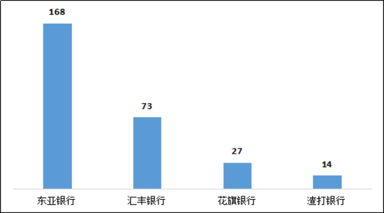 3.东亚银行、汇丰银行、花旗银行的信用卡业务投诉量位居外资法人银行前三名。外资法人银行信用卡业务投诉量的中位数为50件。其中,东亚银行168件,占东亚银行投诉总量的86.2%;汇丰银行73件,占汇丰银行投诉总量的73.0%;花旗银行27件,占花旗银行投诉总量的93.1%;渣打银行14件,占渣打银行投诉总量的45.2%。