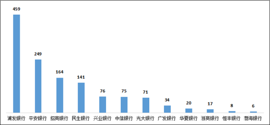 2.浦发银行、平安银行、招商银行的理财类业务投诉量位居股份制商业银行前三名。股份制商业银行理财类业务投诉量的中位数为73件。其中,浦发银行459件,占浦发银行投诉总量的12.7%;平安银行249件,占平安银行投诉总量的6.9%;招商银行164件,占招商银行投诉总量的3.1%;民生银行141件,占民生银行投诉总量的7.0%;兴业银行76件,占兴业银行投诉总量的2.0%;中信银行75件,占中信银行投诉总量的1.7%;光大银行71件,占光大银行投诉总量的3.0%;广发银行34件,占广发银行投诉总量的1.5%;华夏银行20件,占华夏银行投诉总量的2.6%;浙商银行17件,占浙商银行投诉总量的6.5%;恒丰银行8件,占恒丰银行投诉总量的7.4%;渤海银行6件,占渤海银行投诉总量的5.9%。