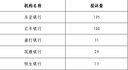 3.渣打银行、东亚银行、恒生银行的个人贷款业务投诉量位居外资法人银行前三名。外资法人银行个人贷款业务投诉量的中位数为10.5件。其中,个人贷款业务投诉量较多的为:渣打银行12件,占渣打银行投诉总量的38.7%;东亚银行11件,占东亚银行投诉总量的5.6%;恒生银行11件,占恒生银行投诉总量的84.6%;汇丰银行10件,占汇丰银行投诉总量的10.0%。