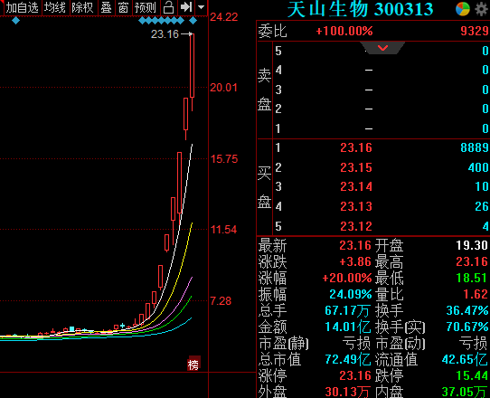 9月3日,天山生物再度涨停,全天成交超14亿元,这已经是该股收获的连续第9个涨停板。短短9个交易日,股价涨了近3倍。