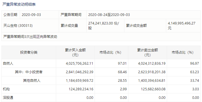 此外,盘后数据显示,天山生物在8月24日至9月3日涨幅严重异常期间获自然人买入40.26亿元,占比97.01%。机构投资者买入占比2.99%。