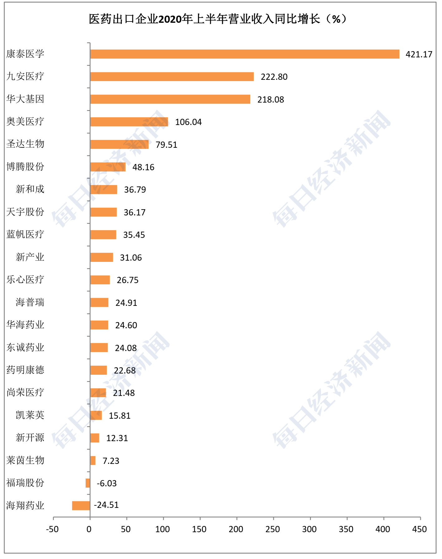 东方财富Choice数据显示,今年上半年,海外收入占比50%以上的医药类企业总计有21家,营业收入同比增长率平均为66%。排名前五位的是康泰医学(300869,SZ)、九安医疗、华大基因(300676,SZ)、奥美医疗(002950,SZ)和圣达生物(603079,SH),营业收入同比增幅分别为421.17%、222.8%、218.08%、106%和79.5%。