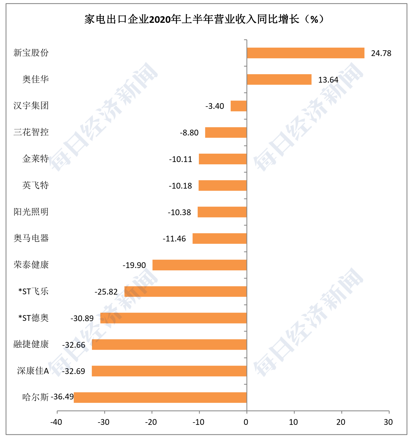 今年上半年,家电出口企业遭到疫情冲击,增速有所下滑。东方财富Choice数据显示,今年上半年,海外收入占比50%以上的家电企业总计有14家,平均营业收入同比增长率为-13.9%。排名靠前的是新宝股份(002705,SZ)、奥佳华(002614,SZ)和汉宇集团(300403,SZ),上半年营业收入同比增长率分别为24.78%、13.64%、和-3.4%。