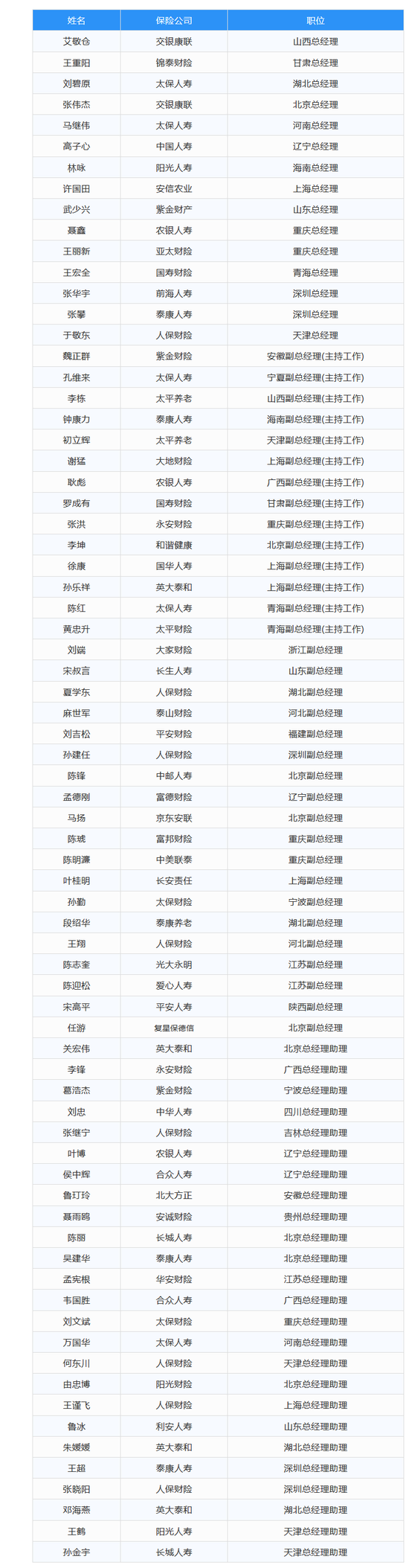 2020年8月,银保监会官网共公布了,7名保险总部董监高,73名省分高管的任职资格,总部一把手更替的有1人,泰康在线董事长刘挺军。