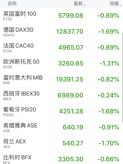 截止收盘,欧洲斯托克50跌1.31%,英国富时100收跌0.89%,德国DAX30跌1.69%,法国CAX40跌0.89%。