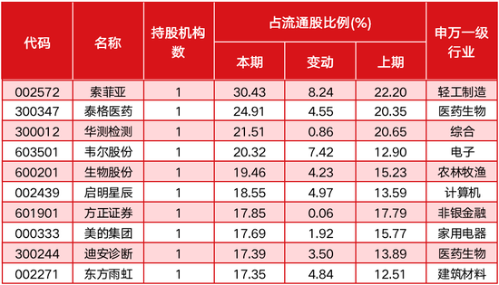 除了QFII,陆股通也是观察外资动向的一大窗口。从中报情况看,从陆股通加仓公司的角度,占流通股比例正向变动的公司中,当期排名前10名的公司为索菲亚、泰格医药、华测检测、韦尔股份、生物股份、启明星辰、方正证券、美的集团、迪安诊断、东方雨虹。其中索菲亚陆股通当期持股比例达到30.43%,居于首位,占流通股比例提升了8.24%。从这些公司所属行业看,集中度不如QFII高,但延续了QFII对行业龙头的高度认可。