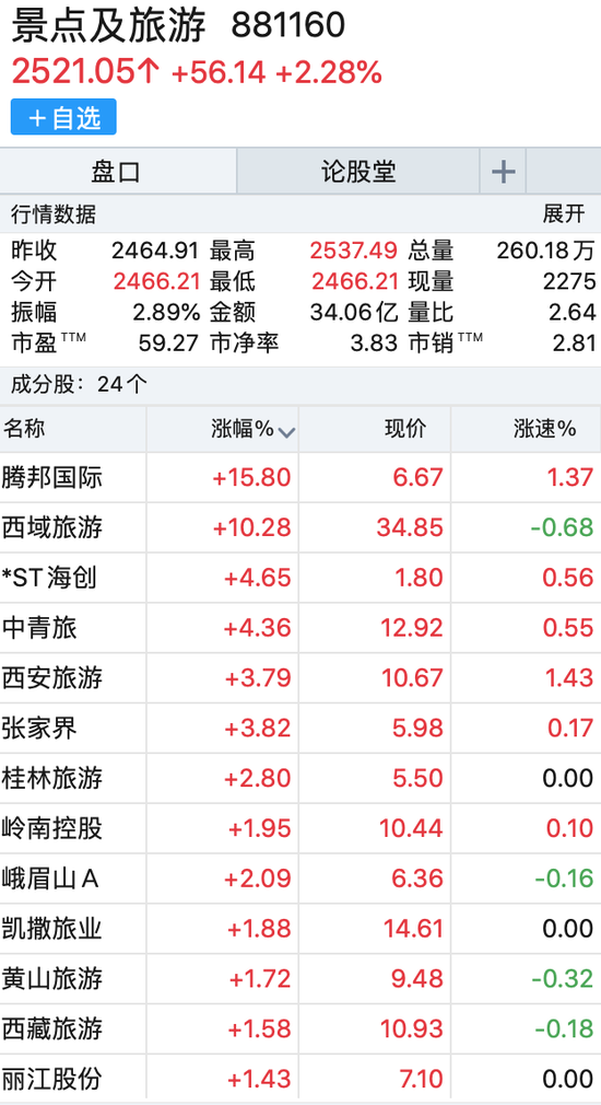9月7日早盘,旅游股普遍上涨,截至发稿,同花顺景点及旅游概念涨超2%,其中腾邦国际涨超15%,西域旅游涨超10%。