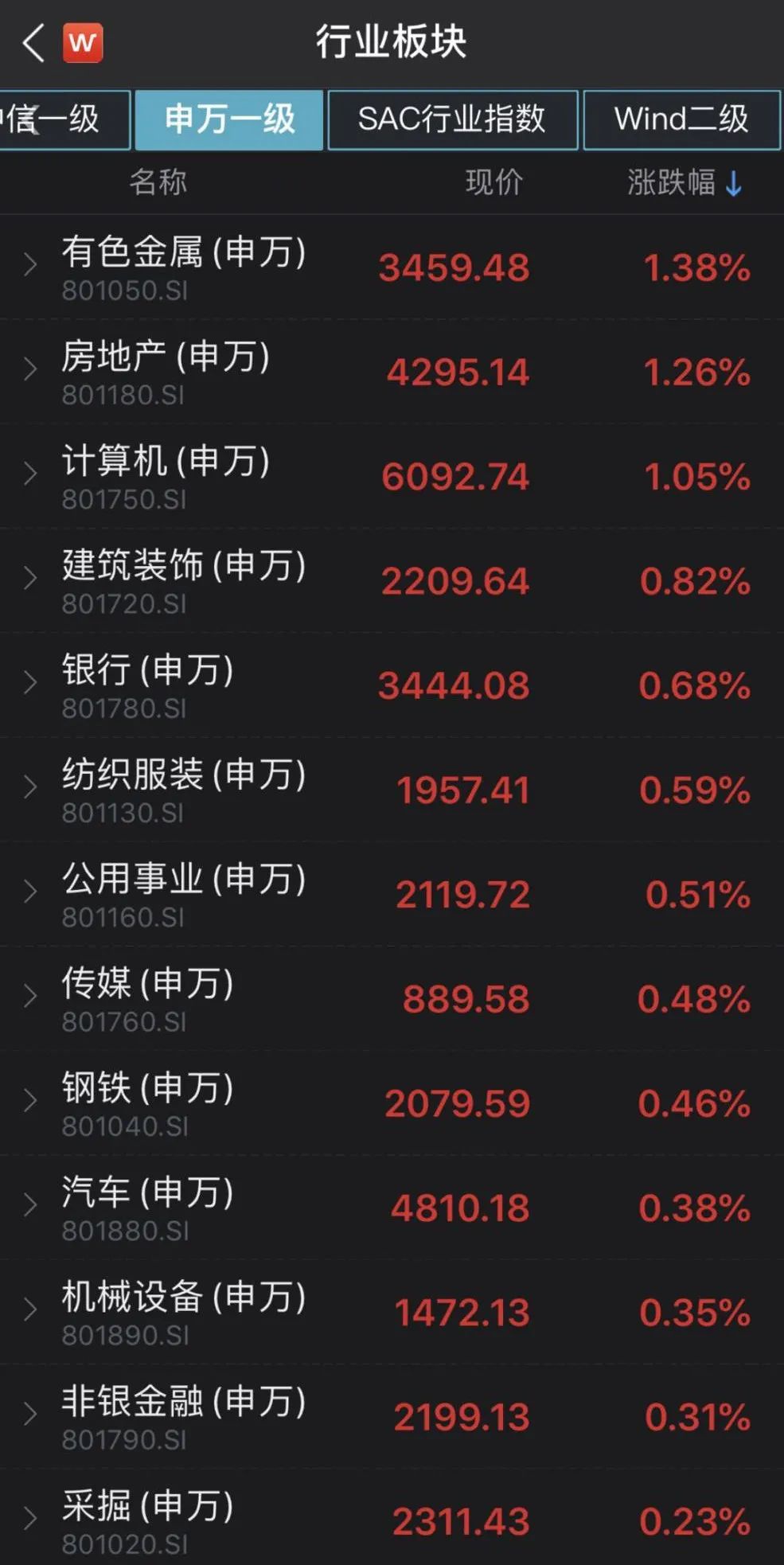 申万一级28个行业中有16个行业上涨,有色金属、房地产、计算机行业涨幅居前,分别上涨1.38%、1.26%、1.05%;农林牧渔、医药生物、电气设备行业跌幅居前,分别下跌2.83%、1.42%、0.95%。