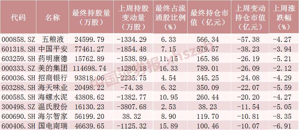 Choice数据显示,上周北向资金对11只个股的持仓市值减少超过10亿元,其中对五粮液持仓市值减少57.38亿元,对中国平安持仓市值减少38.23亿元,对药明康德、美的集团、招商银行、海天味业、海螺水泥的持仓市值减少均超过20亿元。