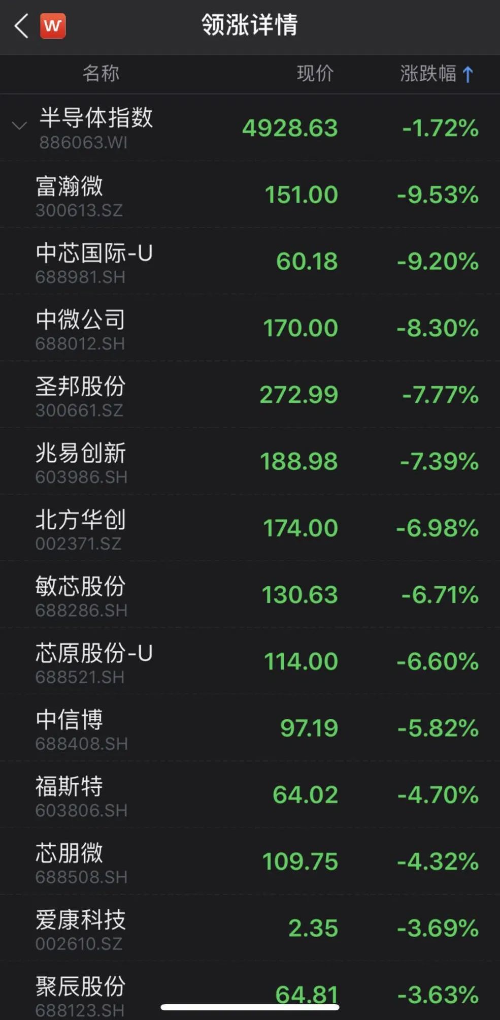 在中芯国际表现不佳的同时,富瀚微、中微公司、圣邦股份、兆易创新、北方华创等个股下跌明显。