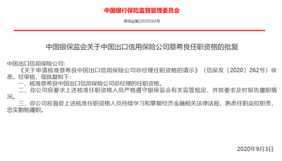 9月7日消息,银保监会公布关于中国出口信用保险公司蔡希良任职资格的批复。经审核,银保监会核准蔡希良中国出口信用保险公司副董事长、总经理的任职资格。