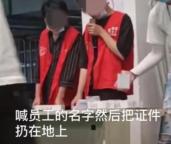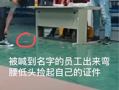 相关视频内容显示,三名分发证件的管理人员不停地念出员工的名字,然后将一张一张证件全部丢在地上,每一个需要领证件的员工都要走在他们面前低头弯腰,像鞠躬一样捡起证件。