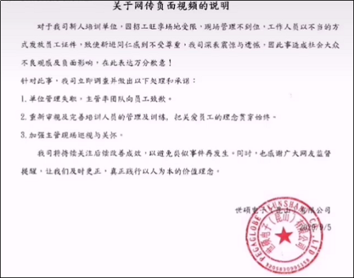 对于我司新人培训单位,因招工旺季场地受限,现场管理不到位,工作人员以不当的方式发放员工证件,致使新人不受到尊重,我司深表震惊与遗憾,因此事造成社会大众不良观感及负面影响,在此表达万分歉意!针对此事,我公司立即调查并作出以下承诺: