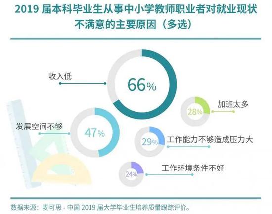 “收入低”(66%)和“发展空间不够”(47%)是2019届本科毕业生从事中小学教师职业者对就业现状不满意的两大主因。