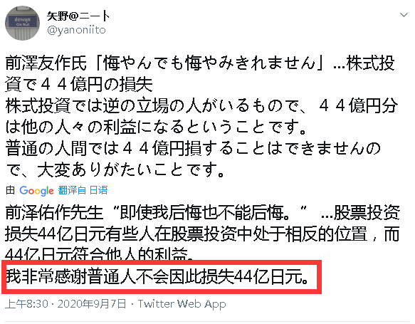 近日,前泽友作在推特上说,疫情下,他炒股损失了44亿日元(约合人民币2.83亿元)。