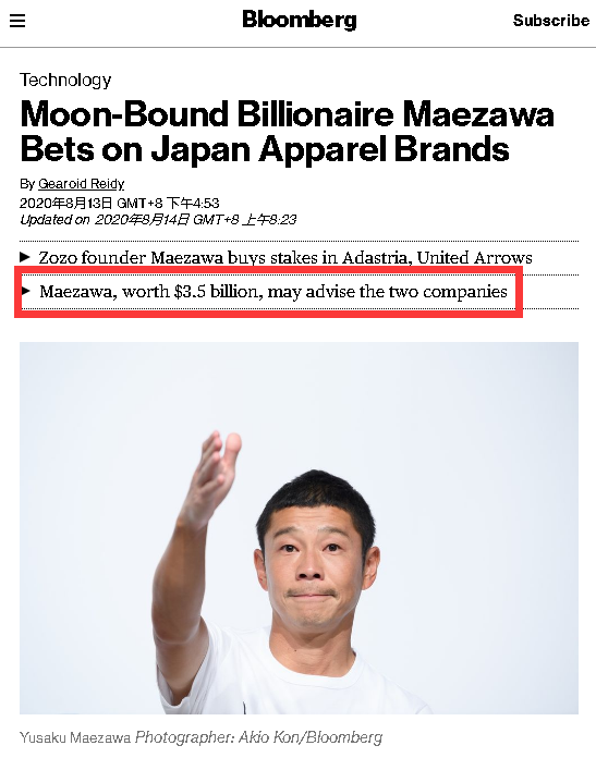 值得注意的是,基金君注意到,关于前泽友作的最新一则交易公告是,8月中下旬, 他斥资76亿日元(近5亿元人民币)成为时尚零售商联合艾诺 (United Arrows )和得荣公司 (Adastria )的第三大股东。