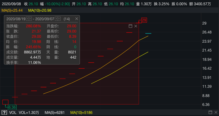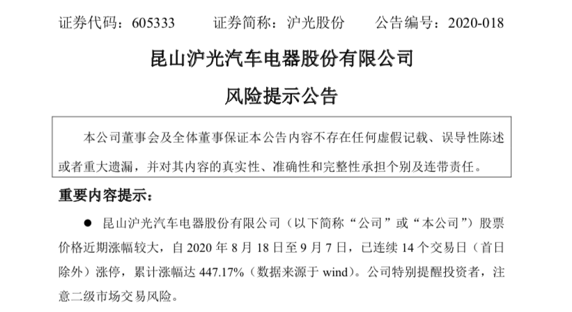 今日一字跌停的沪光股份曾在昨晚发布风险提示公告。其中显示,公司股票价格近期涨幅较大,自2020年8月18日至9月7日,已连续14个交易日(首日除外)涨停,累计涨幅达447.17%。公司特别提醒投资者,注意二级市场交易风险。
