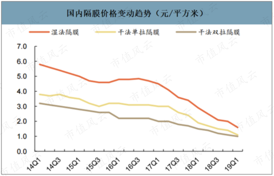 随着国产替代深化、产能不断创新高,湿法隔膜价格下跌也十分迅速。2014年还在6元/平米左右,2020年下半年已降至1.3-1.4元/平米的区间,往后,这种下滑基本不可避免,毛利率也将随之下滑。