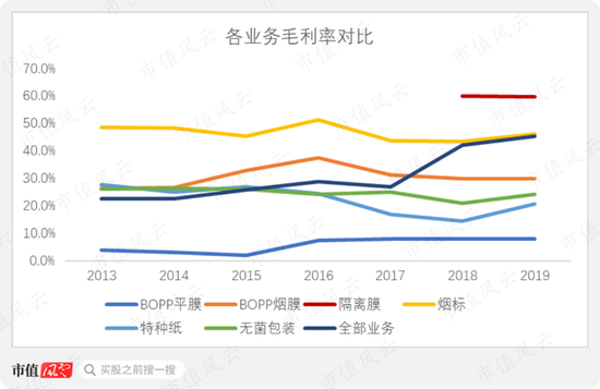 整体来看,烟标乃至烟膜等烟类产品已逐步边缘化。2020年上半年营收贡献不到8000万元。
