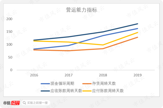 公司现金循环周期持续变长,2019年末达到162.35天,也就是说完成一轮购存销需要近半年的资金占用。