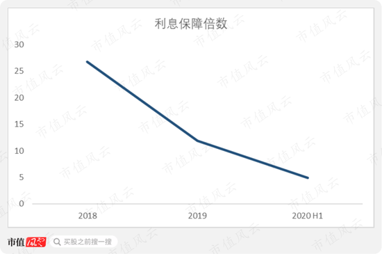 从有息负债的偿付能力来看,公司利息保障倍数下跌迅速,2020年上半年仅为4.9,有突破安全边际的趋势。