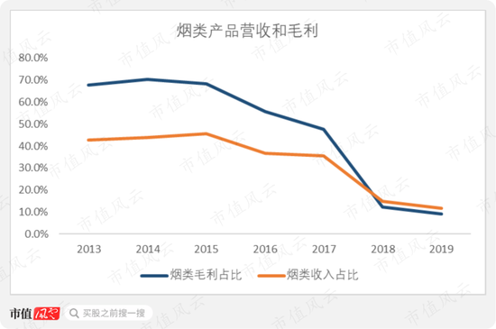 但烟类产品营收占比在2015年后一路走低,在并购前最近的2017年,营收占比和毛利占比已分别下滑至35.57%和47.56%,而在2015年这一数据还是45.53%和68.15%。