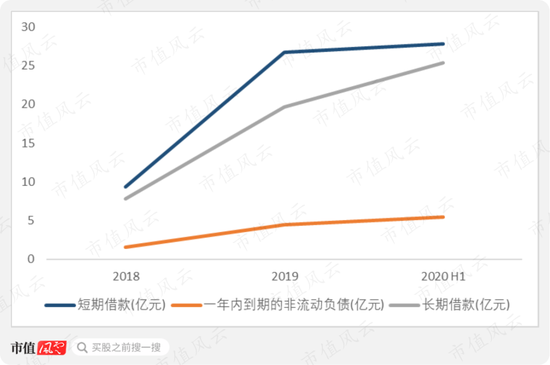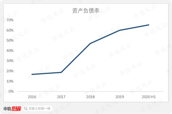 体现在公司的资本结构上,就是资产负债率的快速攀升。公司资产负债率从2016年的16.77%上升至2020年上半年末的65.31%。